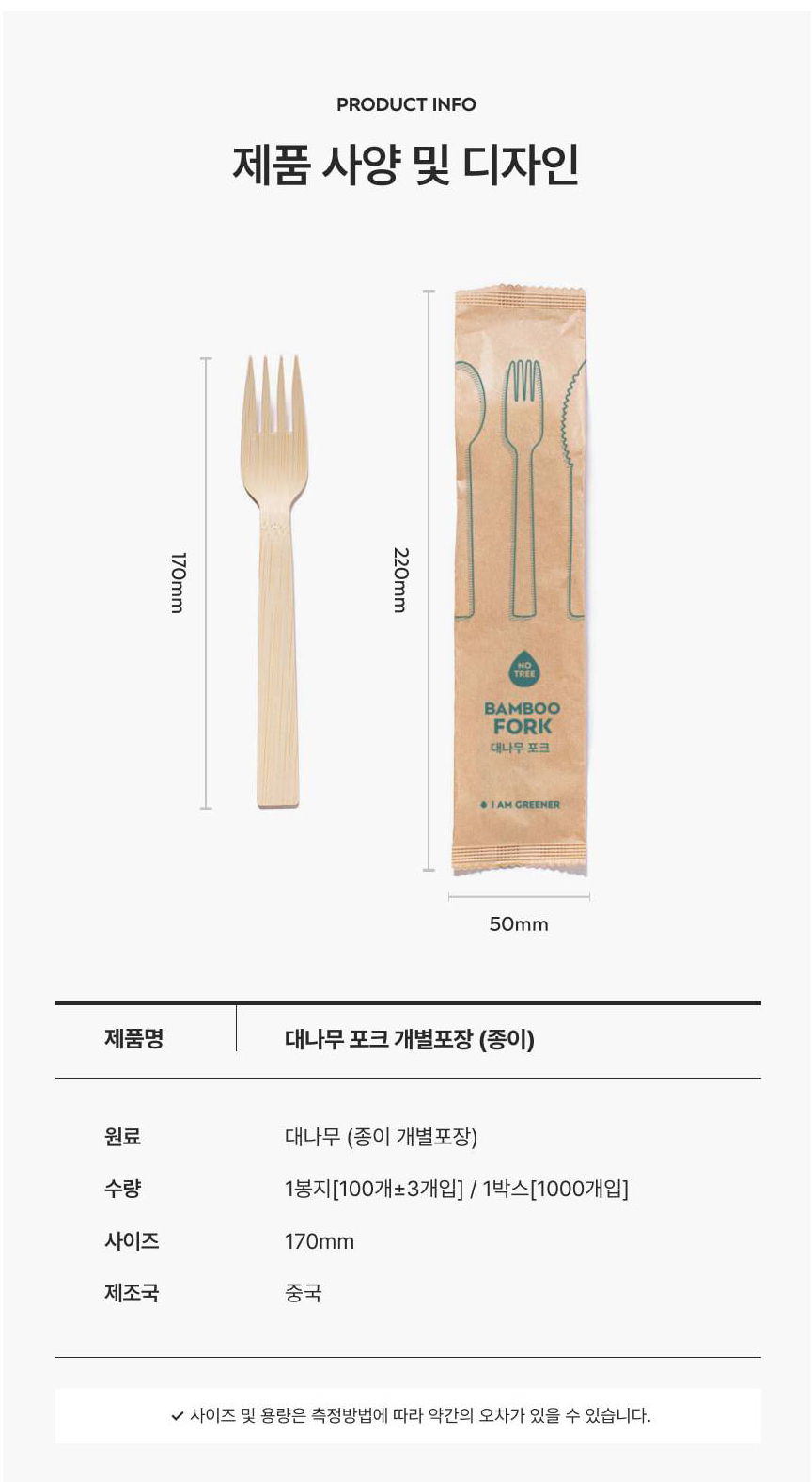 170mm / 대나무 소재 / 종이 개별포장 / 일회용 스푼