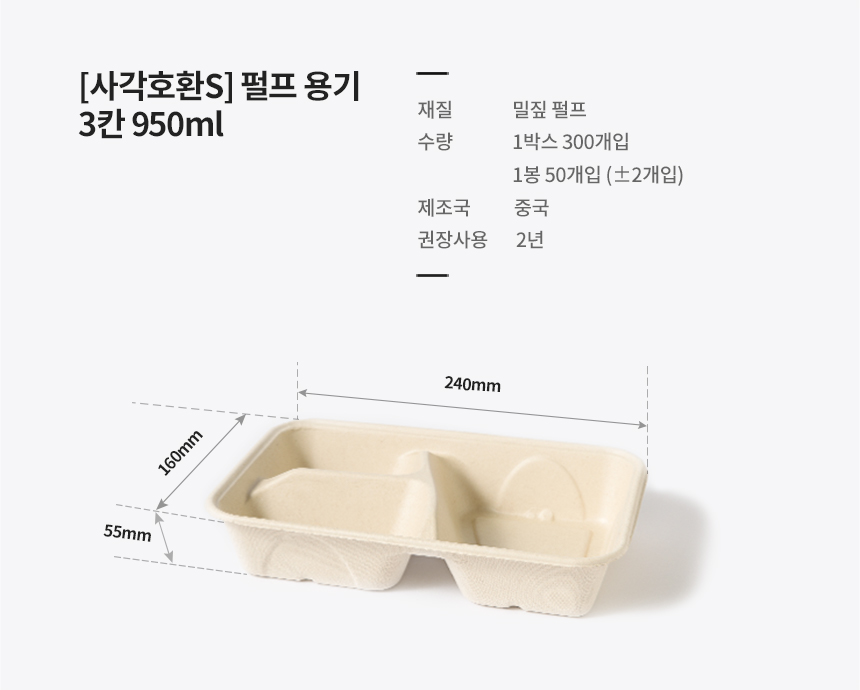 소 950ml / 밀짚 펄프 / PLA뚜껑+용기 세트 / 일회용 3칸 도시락