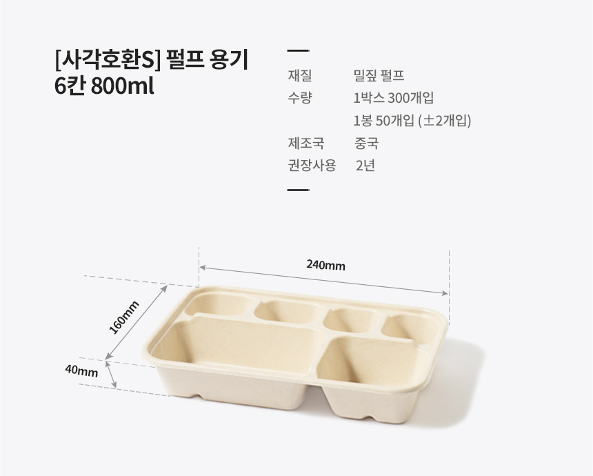 소 800ml / 밀짚 펄프 / 내부 PLA코팅 / 펄프뚜껑+용기 세트 / 일회용 6칸 도시락