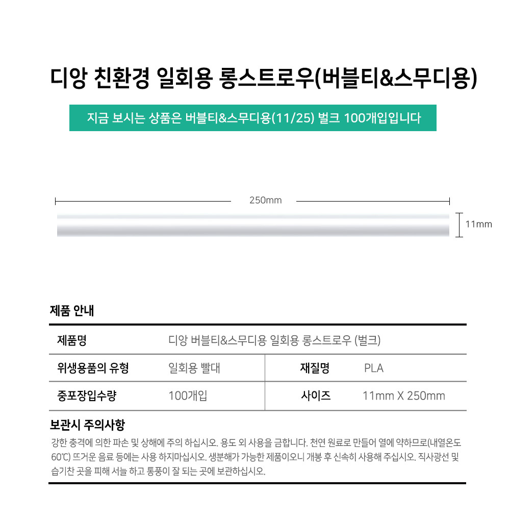 11mmx25cm / 스무디용빨대 / 버블빨대 /   친환경 100% 분해되는 생분해성 (EL724)  빨대 / 환경부 인증마크 / 1,000개 /